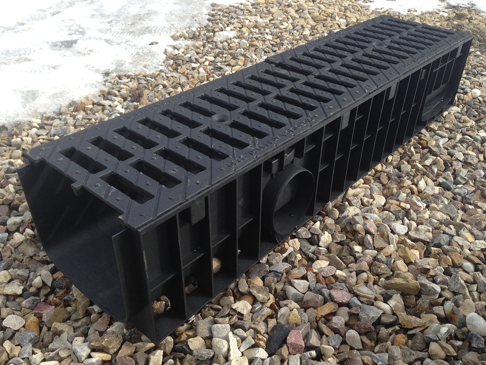 Лоток пластиковый коробчатый высотой 100 мм в сборе с решеткой чугунной щелевого типа. Ширина гидравлического сечения DN200. Комплект предназначен для сооружения систем ливневого водоотвода, дренажных систем с классом нагрузки C250 (до 25 т).