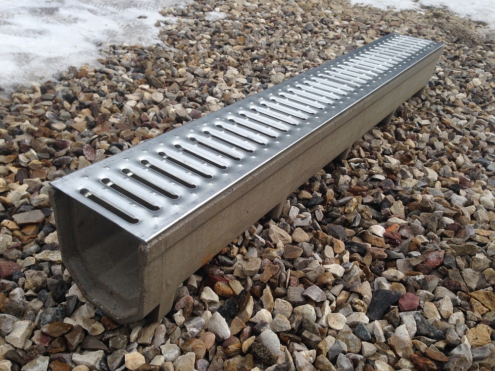 Лоток полимерпесчаный коробчатого типа в сборе с решеткой стальной штампованной. Ширина гидравлического сечения DN100. Комплект предназначен для сооружения систем ливневого водоотвода, дренажных систем с классом нагрузки А15 (до 1,5 т).
