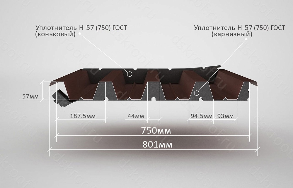 Кровельный уплотнитель РуфИзол Н-57 ГОСТ для профнастила длиной 0,75 метра производится из вспененного пенополиэтилена.